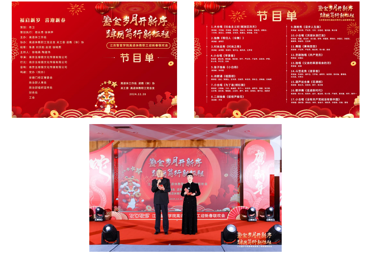 2024年12月28日,学院在安德门校区举办“鎏金岁月开新序 踔厉笃行新征程”离退休教职工迎新春联欢会,庆祝即将到来的2025年,展现离退休教职工们丰富多彩、积极向上的学习工作与精神风貌。学院党委副书记、学院关工委执行主任陈卫出席联欢活动并致辞。