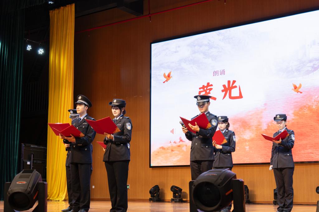 周骥同学深情地朗诵了《致繁星——一门四警,两代忠烈》,用铿锵的声音、深厚的情感勾勒出警察世家的忠诚与担当,令同学们沉浸其中,深感敬佩。
