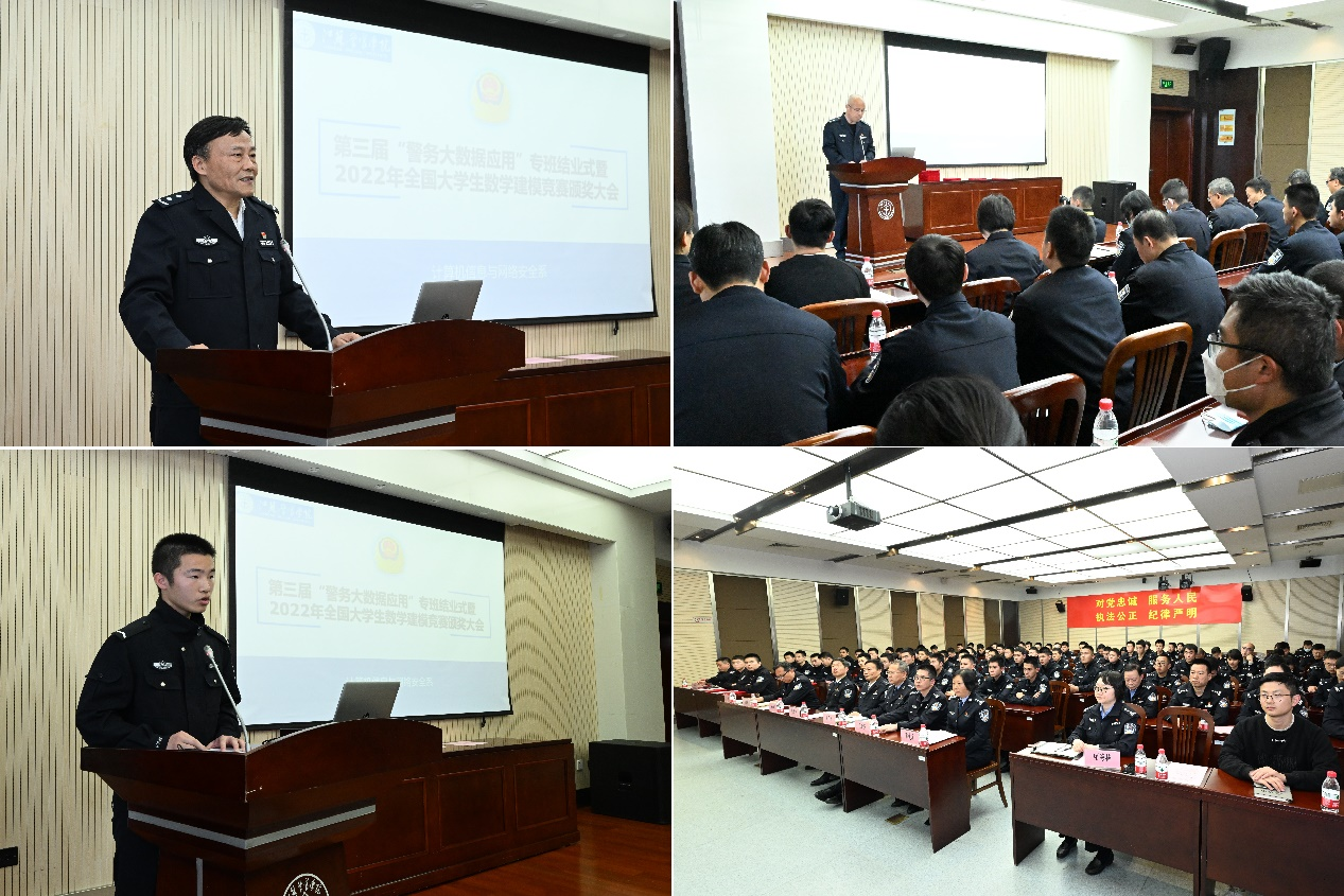 计算机信息与网络安全系主任王群主持仪式,教务处、学生处、刑事科学技术系等部门负责人,网安系和学生八大队教师和学员参加仪式。会上,顾海舟政委、杨世伟副处长、温开殿副处长和徐钟声大队长分别为专班全体学员和数模竞赛获奖团队代表颁发证书。数学建模竞赛获奖学生代表作心得汇报交流。