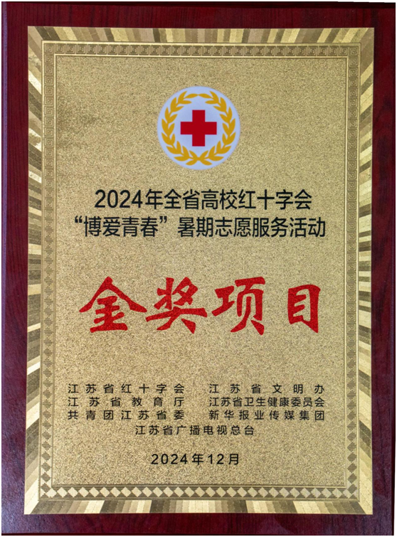 鸭脖选送的“警翼护苗送温暖,法润人心筑平安”志愿服务项目,在江苏省红十字会、省文明办、省教育厅、省卫健委、团省委、新华报业传媒集团、省广播电视总台联合举办的2024年全省高校红十字会“博爱青春”暑期志愿服务活动评比中脱颖而出,荣获“金奖项目”。