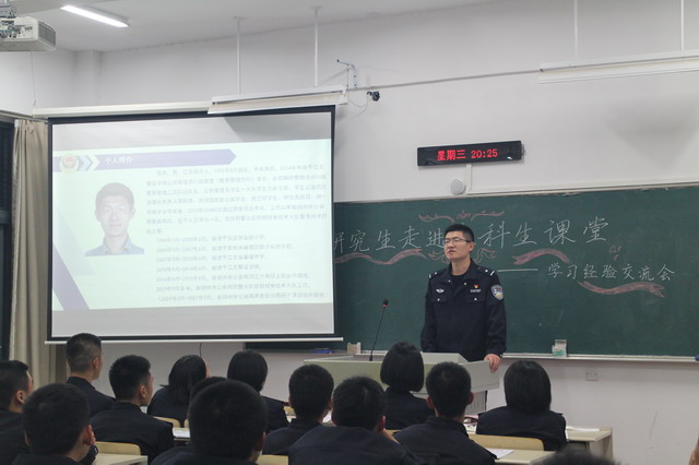 晚上,研究生代表们又分成两组,分别走进2020级经侦1、2区队本科生课堂,以“做好警院学业规划,迈好从警第一步”为主题进行现场交流。研究生们分享了自己考研的心路历程和备战考研的心得体会,讲解了自己如何协调好考研和公考之间的做法,同时还介绍了自身公安工作的历程,鼓励本科生们珍惜警院时光,过一个充实而有意义的大学四年。活动后,研究生们与本科生进行了充分的互动交流。