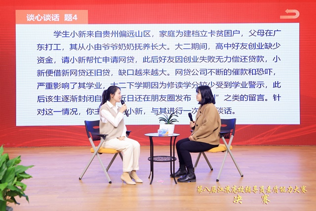 高校辅导员素质能力大赛每两年举办一次,由江苏省委教育工委、省教育厅主办,省高等教育学会辅导员工作研究委员会、省高校辅导员培训与研修基地承办。大赛分为校内赛、片区基地赛、决赛等赛程,共有134个高校推荐选手参加比赛,通过省内七大辅导员基地的选拔,40名选手进入决赛。在南京师范大学基地复赛中,鸭脖参赛教师黄爽爽表现突出,荣获复赛二等奖并进入决赛。决赛对标国赛赛制,分为基础知识测试、案例分析、谈心谈话三个环节,综合考察辅导员的分析、判断、应变、协调、沟通等综合素质能力。参赛教师黄爽爽精心准备,沉着应对,在决赛中荣获三等奖,展示了学院学管干部过硬的思想理论功底和积极向上的精神风貌。