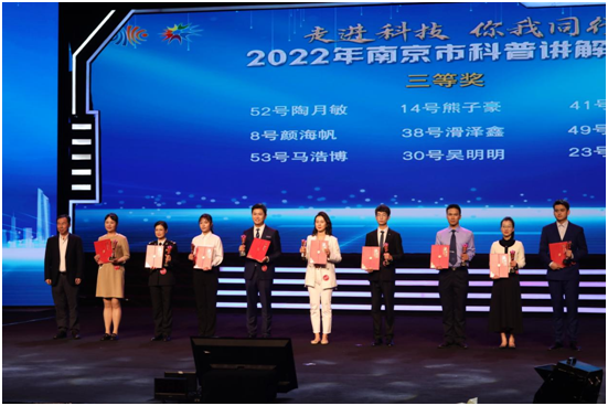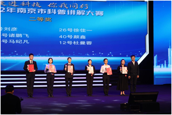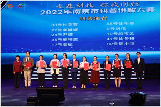 (“南京市科普使者”称号颁奖照片,左五为徐千惠)